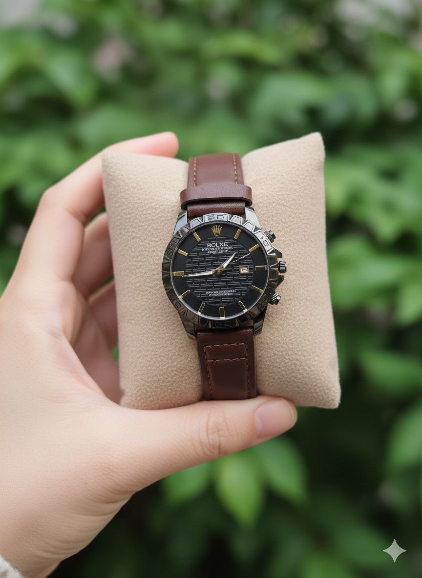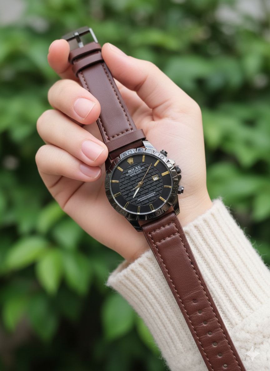 ساعت مردانه رولکس طرح دیت جاست ( Date Just ) بند چرمی قهوه ای صفحه برجسته
