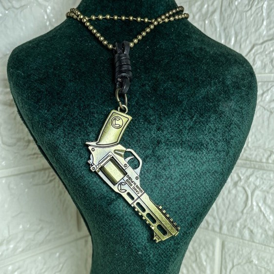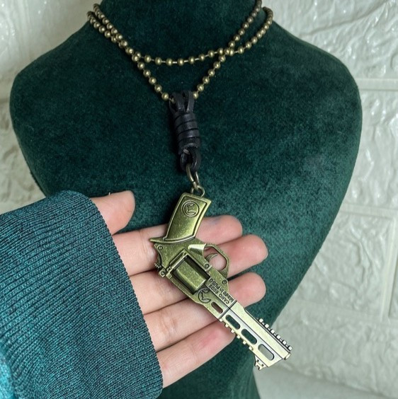 گردنبند و آویز طرح اسلحه هفت تیر از جنس زاماک بوده و به رنگ برنجی است.
