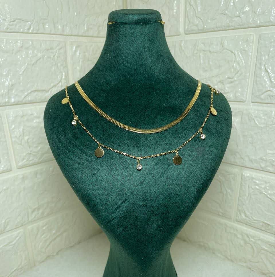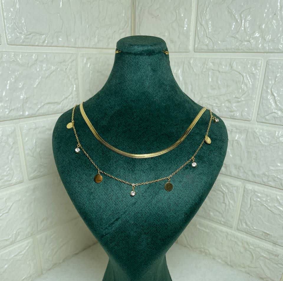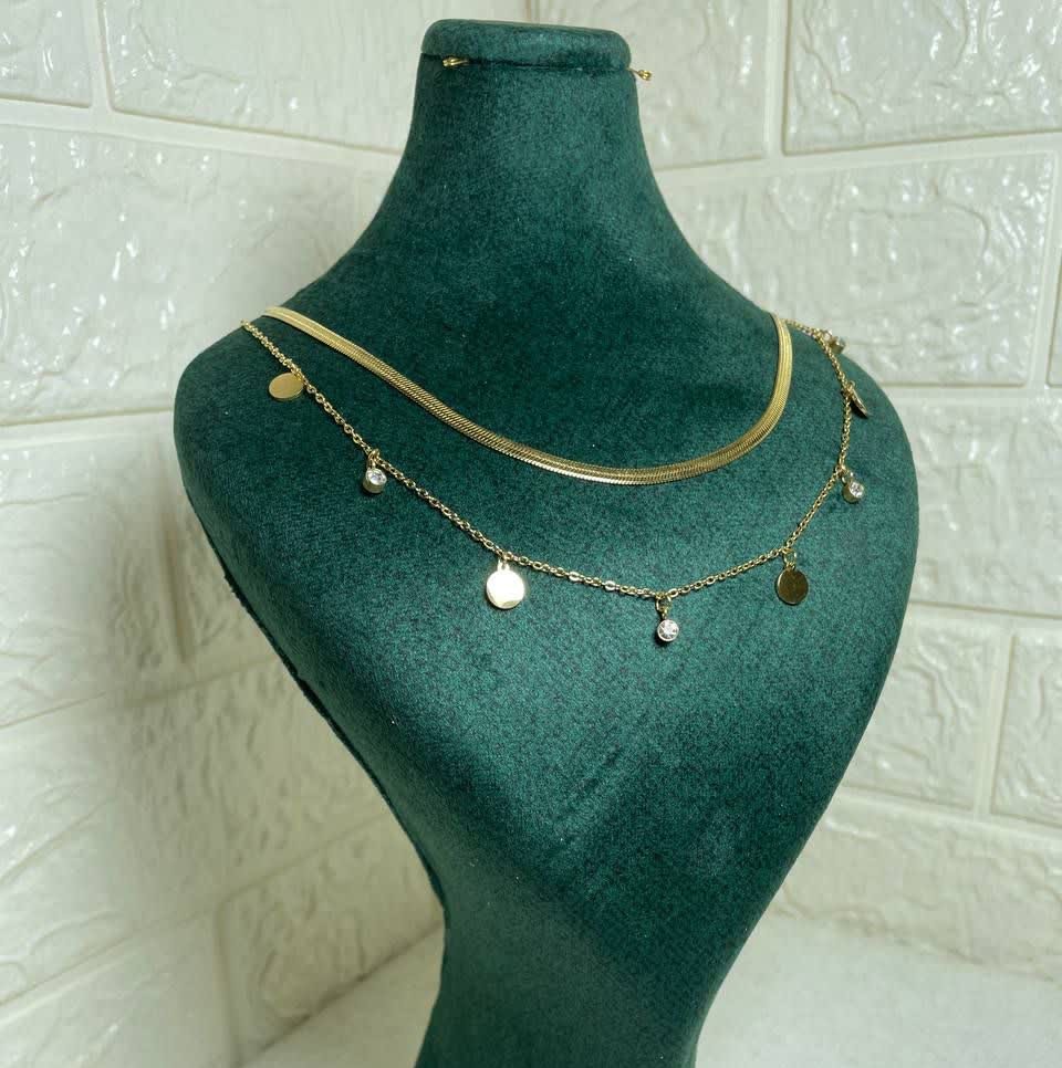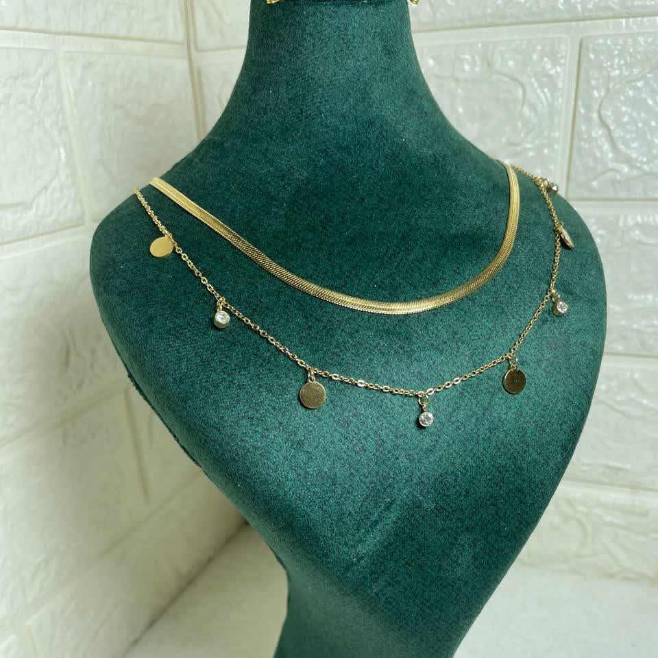 گردنبند دو لاین ماری به همراه زنجیر آویز دار سکه ای و نگین دار ضد حساسیت رنگ ثابت بهترین کیفیت موجود در بازار